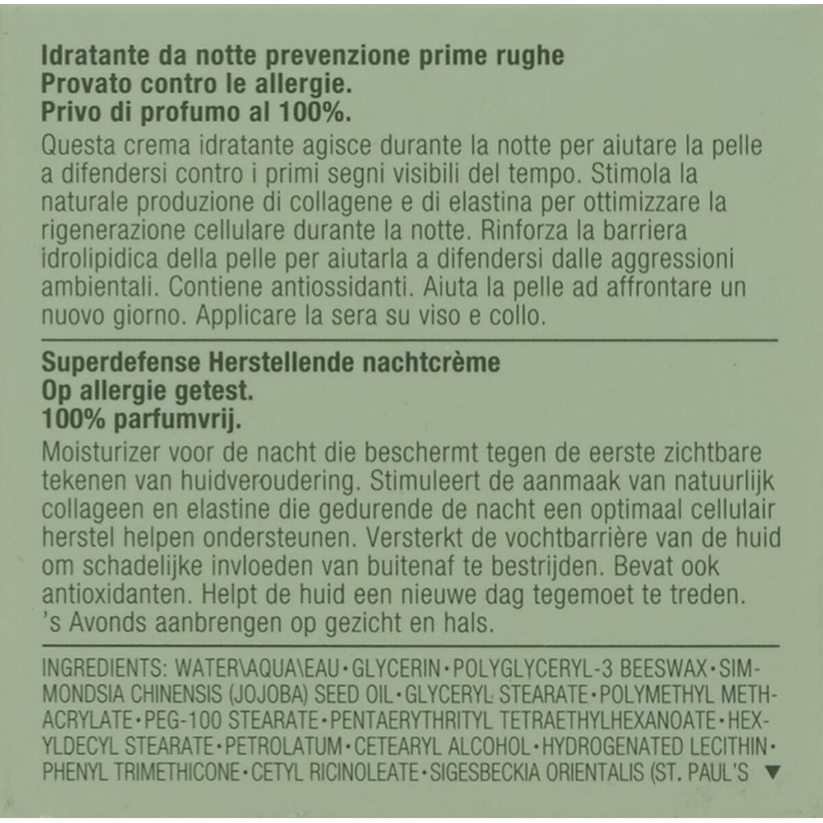 De Superdefense Night II anti-aging crème van Clinique is een nachtbehandeling die diepgaande hydratatie en huidherstel tijdens de rust biedt, ideaal voor alle huidtypes, inclusief normale en droge huid. Deze crème wordt geleverd in een inhoud van 50 ml, voldoende voor langdurig en continu gebruik. Speciaal ontworpen voor vrouwen, combineert het een hypoallergeen en parfumvrij profiel, wat het risico op irritaties minimaliseert en zorgt voor een veilige routine, zelfs voor de gevoelige huid. De romige textuur maakt aanbrengen en absorptie gemakkelijk, en versterkt het natuurlijke herstel en de bescherming van de huid tegen tekenen van veroudering. Hoewel het geen zonnebescherming bevat, richt het zich op nachtelijke regeneratie en revitalisatie, wat bijdraagt aan een verbeterde huidtoon en elasticiteit. Oorspronkelijk uit Spanje en de Verenigde Staten, vertegenwoordigt deze formule een balans tussen effectiviteit en tolerantie, kenmerkend voor de Superdefense-lijn van Clinique. De presentatie en eigenschappen bevestigen de positie als een betrouwbaar product voor wie antioxidatieve en herstellende nachtverzorging zoekt, wat zorgt voor een sterkere en gezondere huid bij het ontwaken. Kortom, de Superdefense Night II is een geschikte keuze om toe te voegen aan de dagelijkse schoonheidsroutine van vrouwen, dankzij de aangepaste samenstelling en focus op bescherming en anti-aging verzorging.