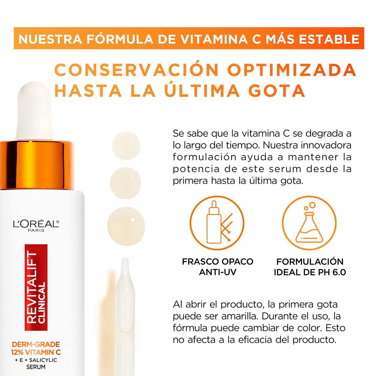 Het anti‑age serum Revitalift Clinical C van L’Oreal Make Up is een geconcentreerde gezichtsverzorging die de stevigheid, de glans en de textuur van de huid helpt verbeteren dankzij een geavanceerde combinatie van dermatologische actieve stoffen, met een inhoud van 30 ml en een handig pompsysteem voor een nauwkeurige en veilige toepassing. De formule is verrijkt met een hoge concentratie vitamine C (ascorbic acid) met een antioxiderende werking, die bijdraagt aan een egalere teint en het verminderen van vermoeidheidstekenen, aangevuld met vitamine E (tocopherol), die helpt beschermen tegen dagelijkse oxidatieve stress. Bevat daarnaast sodium hyaluronate, een vorm van hyaluronzuur die de hydratatie van de huid ondersteunt, en salicylzuur, dat helpt de huidtextuur te verfijnen en poriën te verminderen, wat vooral gewaardeerd wordt bij een gecombineerde huid. Ingrediënten als Poloxamer 338, Polyacrylamide, Polysilicone-11 en xanthan gum zorgen voor een lichte, vloeibare en snel intrekkende textuur, geschikt voor gemengde huid en alle huidtypen, met een comfortabel resultaat zonder vet gevoel. De cosmetische formule, ontwikkeld in Frankrijk, combineert hydraterende bestanddelen zoals glycerine, butylene glycol en caprylic/capric triglyceride met hulpstoffen voor de formulering (zoals ammonium polyacryloyldimethyl taurate, peg-20 methyl glucose sesquistearate en laureth-7), voor stabiliteit en een goede spreiding op de huid. Vrij van parabenen, ontworpen om deel uit te maken van de dagelijkse gezichtsverzorgingsroutine van de vrouw: enkele druppels aanbrengen op een gereinigde huid vóór de gebruikelijke dag- of nachtcrème, als hydraterend en verhelderend serum dat het algemene uiterlijk van de huid geleidelijk verbetert. Dankzij de geavanceerde formule met vitamine C en vitamine E is dit Revitalift Clinical C serum een gerichte keuze voor wie een geconcentreerde anti‑age behandeling zoekt voor een egalere, gladdere en stralendere huid.