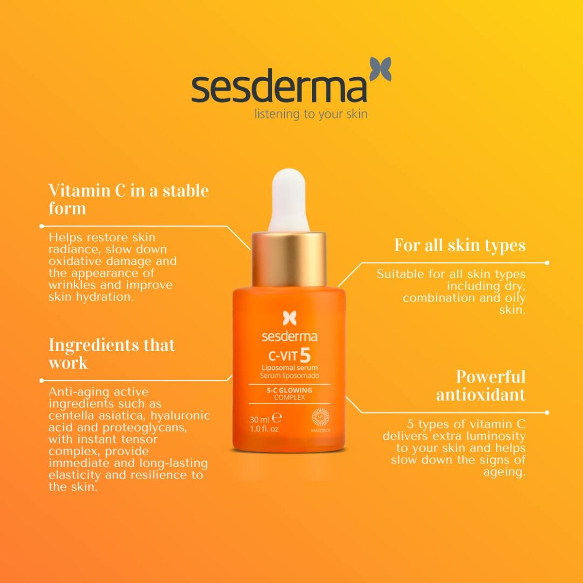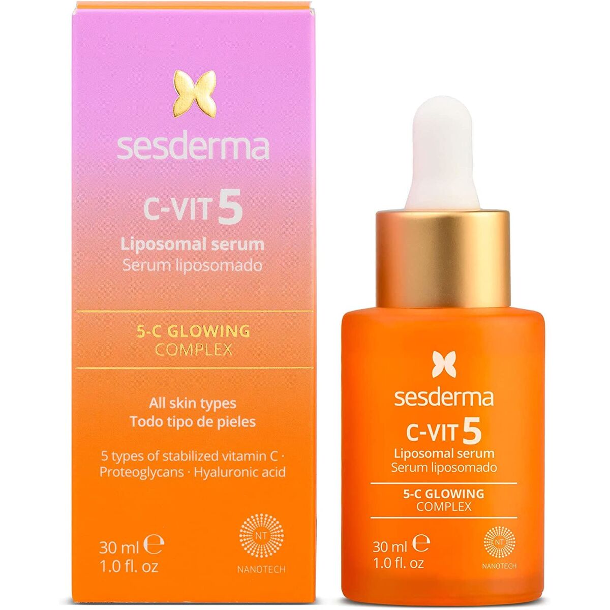 Het C-VIT 5 liposomal Sesderma Vit gezichtserum is samengesteld als een hoogwaardig vitamine C-behandelingsproduct voor alle huidtypes, binnen de categorie dermocosmetica en parafarmacie voor dagelijks gebruik, zowel ’s ochtends als ’s avonds. De lichte textuur als serum met doseerpomp zorgt voor een nauwkeurige applicatie en snelle opname, ideaal als eerste stap na de reiniging vóór de gebruikelijke hydraterende crème. Het bevat een stabiele combinatie van vitamine C-derivaten zoals sodium ascorbate, ascorbyl glucoside, magnesium ascorbyl phosphate en 3-O-ethyl ascorbic acid, ontwikkeld voor een antioxidatieve werking, bescherming tegen dagelijkse oxidatieve schade en ter ondersteuning van een stralendere huidskleur. De formule wordt aangevuld met hyaluronzuur (sodium hyaluronate), bekend om zijn vermogen om water vast te houden en zo de huid gehydrateerd en gladder te laten ogen, evenals met glycerine en andere bevochtigende stoffen die de barrièrefunctie ondersteunen. Het ingrediëntcomplex bevat daarnaast plantaardige extracten zoals Centella asiatica en Caesalpinia spinosa fruit extract, veelgebruikt in gelaatsverzorging vanwege hun bijdrage aan het huidcomfort, samen met tocopheryl acetate (vitamine E) dat het antioxidatieve profiel van het product versterkt. De aanwezigheid van phosphatidylcholine en sodium cholate hangt samen met liposomale systemen die de afgifte van werkzame stoffen bevorderen, terwijl polymeren zoals polymethyl methacrylate en xanthan gum helpen de textuur en stabiliteit van de formule te optimaliseren. Dermatologisch getest, het serum wordt geleverd in een verpakking van 30 ml, geschikt voor continu gebruik, en is ontwikkeld in Spanje volgens specifieke verzorgingsnormen voor de vrouwelijke huid, al is de samenstelling ook geschikt voor verschillende gebruikersprofielen die een dagelijkse antioxidatieve boost wensen. Dit gezichtserum van Sesderma positioneert zich als een gespecialiseerde verzorging met vitamine C en hyaluronzuur die eenvoudig in de dagelijkse huidverzorgingsroutine kan worden geïntegreerd.