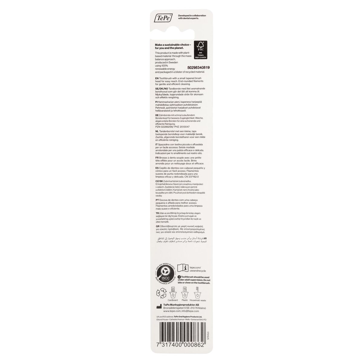 De Tepe Compact Soft Tandenborstel is een handtandenborstel die speciaal is ontworpen voor een effectieve mondreiniging met maximale zorg voor het tandvlees en glazuur dankzij de zachte borstelharen, ideaal voor alle gebruikers, ook voor mensen met gevoelig tandvlees. Dit compacte model maakt het gemakkelijk om moeilijk bereikbare plekken te reinigen en past comfortabel in de mond van zowel volwassenen als tieners of gebruikers met specifieke behoeften. Het heeft een unisex ontwerp en is verkrijgbaar in meerkleurige varianten met verschillende prints die willekeurig worden verzonden afhankelijk van de voorraad, wat zorgt voor variatie en kleur in de dagelijkse mondverzorging. Het ergonomische handvat biedt een comfortabele en veilige grip, waardoor het poetsen gemakkelijker wordt en een goede poetstechniek wordt bevorderd bij dagelijks gebruik. De Tepe Compact Soft voldoet aan de Europese kwaliteitsnormen en is gemaakt van duurzame, veilige materialen, wat zorgt voor een betrouwbare en comfortabele poetsbeleving voor het hele gezin. Deze optie is bijzonder aan te raden voor wie op zoek is naar een effectieve, tandvleesvriendelijke en veelzijdige tandenborstel qua ontwerp en gebruik. Deze zachte handtandenborstel van Tepe is zonder twijfel een handige en betrouwbare keuze voor de dagelijkse mondverzorging van veeleisende gebruikers.