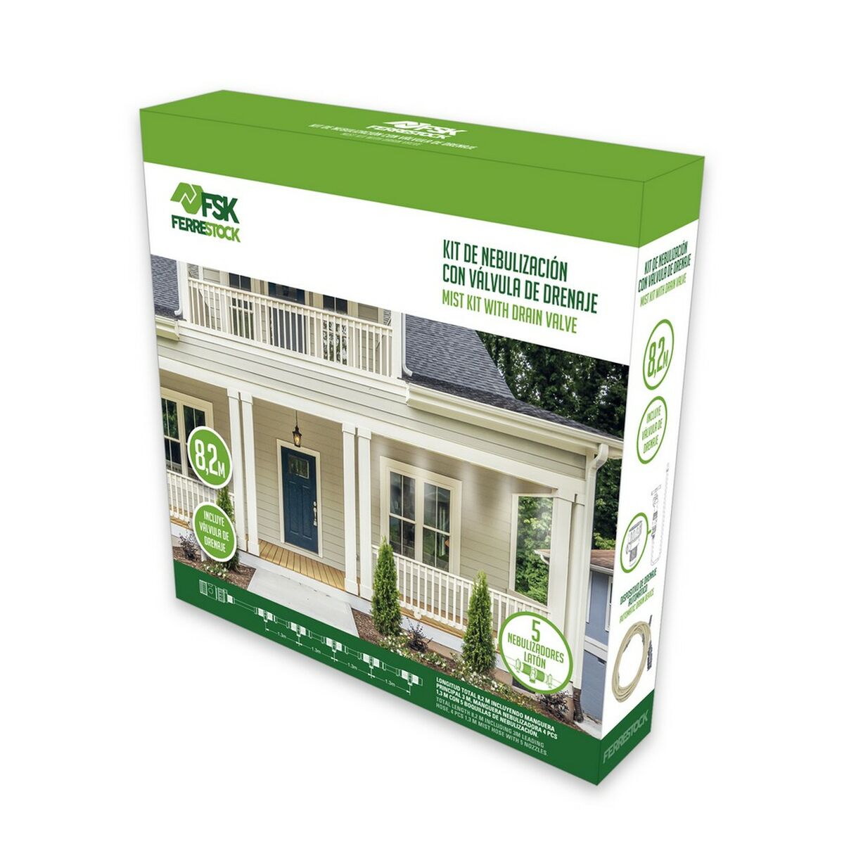 De nevelaar van Ferrestock is een systeem ontworpen voor een efficiënte oplossing voor zowel insectenafweer als buitenkoeling in woon- en commerciële omgevingen. De hoofdstructuur bestaat uit een kit van 8,2 meter lang met vijf messing nevelmondstukken die een fijne mist van microscopische waterdruppels verspreiden. Zo ontstaat een natuurlijke barrière tegen insecten en wordt de buitentemperatuur merkbaar verlaagd op plekken zoals parasols, zonneschermen, pergola’s, terrassen, balkons of bij zwembaden. Dankzij de witte kleur en geselecteerde materialen past het discreet in de omgeving en is het bestand tegen buitenomstandigheden. Inclusief een 3/4″ aftapkraanconnector en gaasfilter die de juiste druk behouden en overmatig druppelen voorkomen, wat de levensduur van het systeem verlengt en de werking optimaliseert. De set bevat slangen van verschillende lengtes (hoofdslang van 3 meter en secundaire slangen van 1,3 meter, beide 3/8″), evenals klemmen en borgmoeren, voor een eenvoudige installatie op diverse buitensystemen. Het ontwerp maakt het geschikt voor kleine kassen om de juiste luchtvochtigheid te behouden en het kan ook op zonneschermen of andere oppervlakken worden gemonteerd dankzij de eenvoudige montage en meegeleverde bevestigingen. Deze Ferrestock nevelaar werkt met een extern nevelkoelsysteem dat bekend staat om zijn efficiëntie, en de mogelijkheid om een natuurlijke barrière te creëren zonder chemicaliën maakt het ideaal voor huishoudens of bedrijven die waarde hechten aan comfort in buitenruimtes. Alle benodigde onderdelen voor montage en adapters voor kranen van verschillende maten zijn inbegrepen, zodat het compatibel is met de meeste standaard huishoudelijke installaties. Kortom, de Ferrestock nevelaar is bedoeld voor wie een complete en praktische oplossing zoekt voor koeling en insectenbescherming in buitenruimtes.